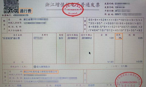 辦理ETC的用戶開具的發(fā)票有下面幾種:a. 左上角標(biāo)識(shí)“通行費(fèi)”字樣,且稅率欄次顯示適用稅率或征收率的通行費(fèi)電子發(fā)票(以下稱征稅發(fā)票),如下圖: