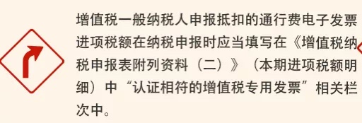 (一)增值稅一般納稅人申報(bào)抵扣的通行費(fèi)電子發(fā)票進(jìn)項(xiàng)稅額,在納稅申報(bào)時(shí)應(yīng)當(dāng)填寫在《增值稅納稅申報(bào)表附列資料(二)》(本期進(jìn)項(xiàng)稅額明細(xì))中“認(rèn)證相符的增值稅專用發(fā)票”相關(guān)欄次中。