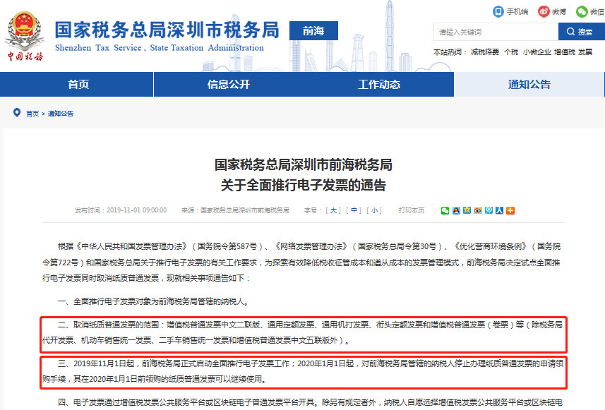 去年,深圳市前海稅務(wù)局發(fā)布《關(guān)于全面推行電子發(fā)票的通告》。決定從2019年11月1日起,全面推行電子發(fā)票同時取消紙質(zhì)普通發(fā)票。2020年1月1日起,停止辦理紙質(zhì)普通發(fā)票的申請領(lǐng)購手續(xù)。