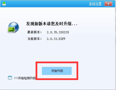 打開軟件提示升級,根據更新提示關掉開票軟件主界面,點擊“開始升級”按鈕,系統自動下載升級程序并啟動安裝,直至安裝完成即可。
