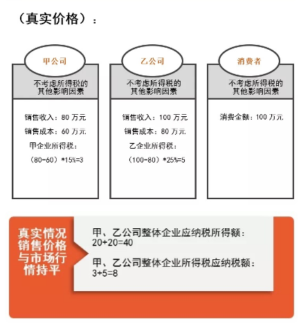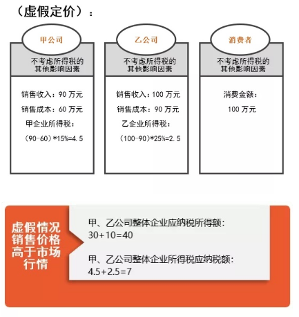 假設二公司謀劃:甲公司以高毛利銷售產品給乙公司,利用甲稅率<乙稅率,已達到減少整體稅務的目的。對比虛假定價與真實價格如下: