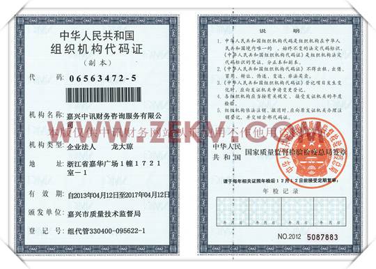 機構代碼 : 質量監督局審核通過獲得質監局頒發的組織機構代碼證。