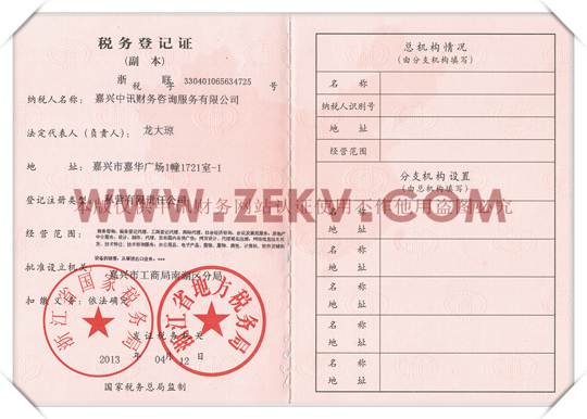 國稅登記 : 稅務機關國稅局審核通過獲得國稅局頒發的稅務登記證。